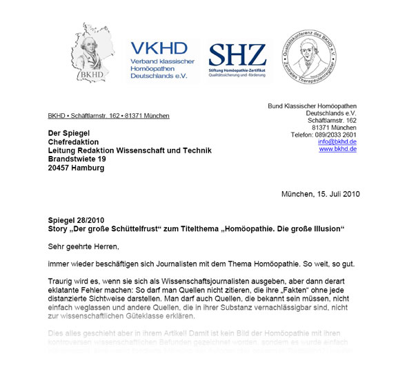 Derzeit greifen die Medien das Thema Homöopathie auf. Unter anderem auch der Spiegel. Der Verband klassischer Homöopathen Deutschlands hat zum Thema einen Leserbrief an die Spiegelredaktion veröffentlicht, den wir hier wiedergeben.