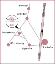 Westerhofen liegt ca. 1,5 km außerhalb von Sonthofen. Wenn Sie über die B19 anreisen, nehmen Sie bei Sonthofen die südliche Abfahrt und folgen der Beschilderung in Richtung Ofterschwang. In Westerhofen biegen Sie vor der Bushaltestelle rechts ab in Richtung Bihlerdorf. Meine Praxis befindet sich am Ortsausgang, im letzten Haus links, schräg gegenüber der Bäckerei